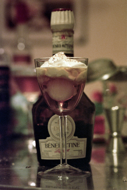 Add Benedictine to glass, float in egg yolk. Layer cream on top and grate nutmeg over.